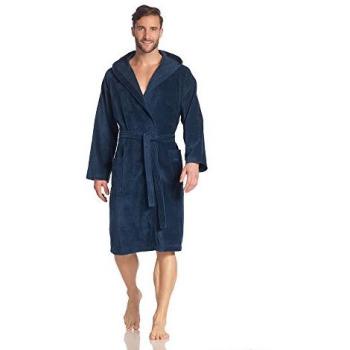 Ein kurzer, weicher Bademantel aus Baumwoll‑Velours in tiefem Blau, der mit einer praktischen Kapuze und einem verstellbaren Gürtel ausgestattet ist – ideal für entspannte Stunden im Bad oder Spa.