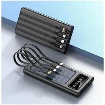 Powerbank externe Goobay 53934, batterie LiPo de 20000 mAh, charge rapide USB-C PD et QC 3.0, 2 ports USB-A, panneau solaire intégré, écran d’indication LED, design robuste noir pour l’extérieur.