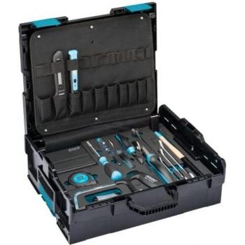 Bac à outils en plastique bleu de 215×396×294 mm, capacité 190 L, ouverture large et poignée aluminium robuste pour un transport sans effort ; idéal pour organiser vos outils sur le chantier.