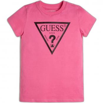 T‑shirt Guess en rose clair, imprimé triangle irisé métallique qui scintille sous la lumière. Coupe décontractée, tissu doux et respirant, idéal pour un look chic et confortable au quotidien.