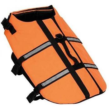 Orange safety life jacket for medium dogs, 45 cm long, with a reinforced handle and bright reflective panels that keep your pet buoyant and visible in any water setting while staying lightweight and snug.
