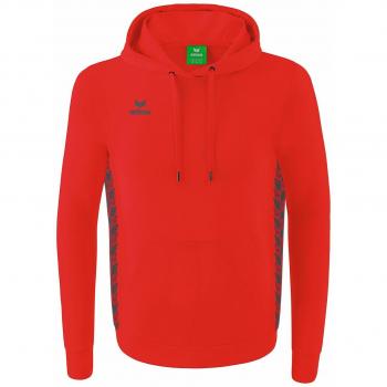 Der Erima Kapuzensweat in Dunkelblau bietet ein atmungsaktives Baumwoll‑Polyester-Mix, kuscheliges Innenfutter und eine praktische Kängurutasche; die leichte Kapuze schützt bei Wind, während das subtile Teamlogo Stil verleiht.