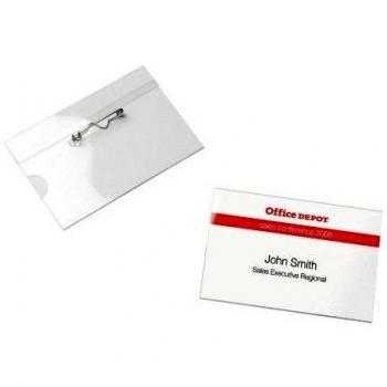Klassische transparente Namensschilder im Querformat (75 × 40 mm) in einem Paket mit 50 Stück – jeder Träger besitzt eine Sicherheitsnadel und einen Clip für sicheren Halt an Kleidung oder Tasche.