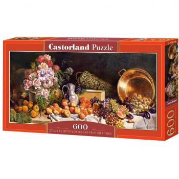 Ein farbenfrohes Dreieckspuzzle mit 1000 Teilen zeigt ein lebendiges Blumenpanorama in warmen Pastellfarben; das beiliegende Poster lädt zum Verweilen und Genießen der Natur ein.