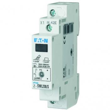 Ein kompakter, orangefarbener Modulschalter mit integrierter LED, der für 230 V AC/DC ausgelegt ist und bis zu 16 A verträgt; er kombiniert einen Öffner‑ und einen Schließerkontakt in einem robusten DIN‑schienenfähigen Design.