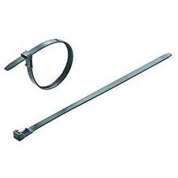 Robuste schwarze Kabelbinder von ABB, 143 mm Länge und 3,3 mm Durchmesser, UV‑stabilisiert für dauerhafte Befestigungen im Freien. Jede Packung enthält 100 Stück.