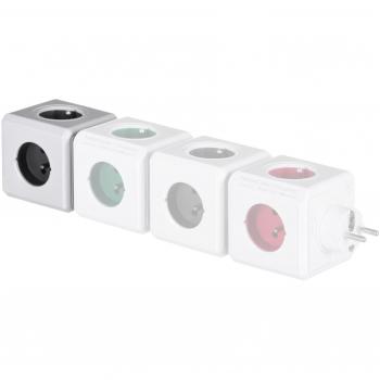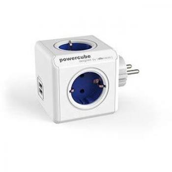 Ein schlanker grauer PowerCube von Allocacoc mit vier AC‑Steckdosen und zwei USB‑Ports (Typ B) für 5 V lädt Handys, Tablets oder Kameras gleichzeitig – platzsparend und modern.