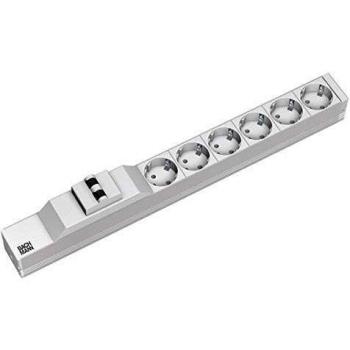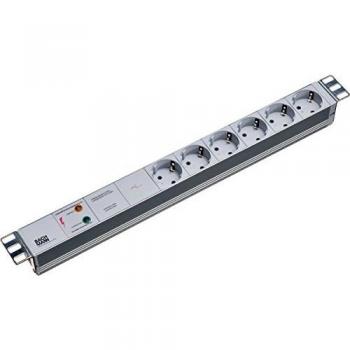 Schwarze Aluminium‑PDU 1U mit sechs Schuko‑Eingängen und drei C19‑Ausgängen, ausgestattet mit einer 2 m langen C20‑Zuleitung; kompakte Bauweise für Rack‑Umgebungen, robustes Design, hohe Zuverlässigkeit.