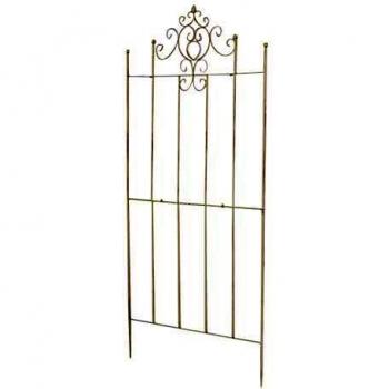 Ein robustes Eisenrankgitter in antikgrün, das mit kunstvollen Ornamenten einen nostalgischen Landhauscharme verleiht und Kletterpflanzen sicher umschließt, während es gleichzeitig als stilvolles Gartenaccessoire wirkt.