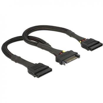 Ein kompakter Stromadapter von 16,5 cm Länge verbindet die 15‑Pin‑SATA‑Buchse einer Festplatte mit zwei 4‑Pin‑Molex‑Steckern, sodass interne Laufwerke ohne Kabelsalat direkt vom Netzteil gespeist werden.