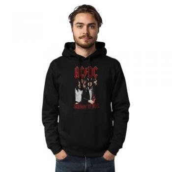 Ein schwarzer Damen-Kapuzenpullover in XS, gefertigt aus hochwertigem Baumwoll-Polyester-Mix; das markante AC/DC High Voltage Logo wirkt im Distressed‑Stil rockig und lässig zugleich.