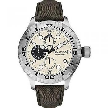Die Nautica BFD 102 besticht durch ihr schlichtes, grün‑gelblich beleuchtetes Zifferblatt und das leichte beige Textilarmband; die Quarz‑Mechanik liefert präzise Zeitmessung, während das kompakte Design sowohl im Büro als auch beim Wochenendausflug stilvoll wirkt.
