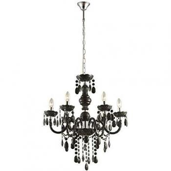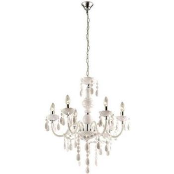 Ein schlichter, chromierter Kronleuchter mit fünf klaren Kristallen, umgeben von einer weißen Acrylhülle; die Höhe von etwa 44 cm lässt ihn ideal in Wohnzimmer oder Esszimmer wirken und spendet ein warmes, dezentes Lichtspiel.