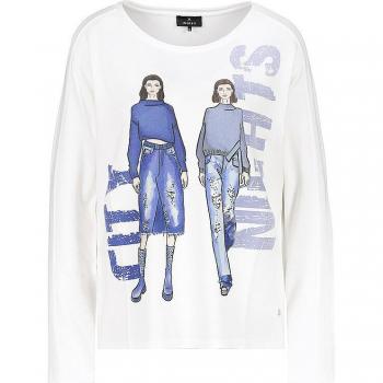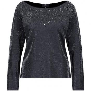 Ein silberglänzendes Damenlangarmshirt in Grau, Größe 44, verziert mit funkelnden Strasssteinen und zarten Pailletten; ideal für festliche Nächte oder stilvolle Alltagsoutfits.