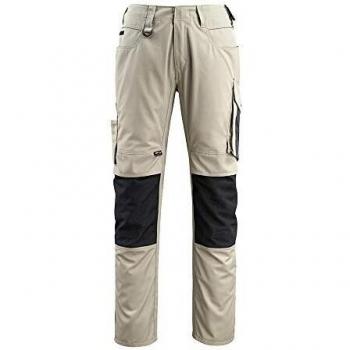 Hochwertige Arbeitshose Mannheim in klassischem Khaki/Schwarz, Größe 48, mit elastischer Taille für flexible Passform. Mehrere robuste Taschen halten Werkzeuge sicher, während atmungsaktiver Stoff bei langen Arbeitsstunden kühl hält.
