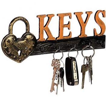 Vintage Schlüsselbrett mit 5 Haken und Vorhängeschloss, Gusseisen, orange/schwarz, hbt 10x26x3 cm - Relaxdays
