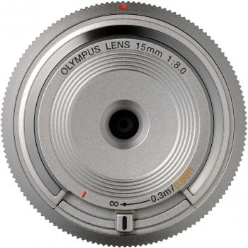 Ein leichtes, rotes Mikro‑Vier‑Thirds‑Objektiv mit 15 mm Brennweite und f/8 Blende, das dank kompakter Pancake‑Form schnell gewechselt werden kann; die klare Optik liefert scharfe Details bei Landschaften, Architektur oder Street‑Photography.