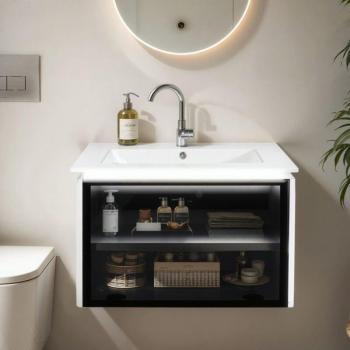 Keramikwaschbecken-Unterschrank 60 cm – Glasfront, Induktionslicht, weiß