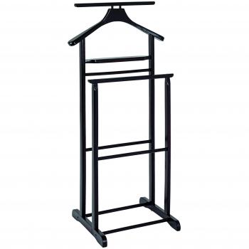 Schwarzer Massivholz‑Kleiderständer mit asymmetrischer Form, 102 cm hoch, 47 cm breit und 36 cm tief. Er verfügt über eine Hosenbügel‑Trageleine und zwei schmale Regalböden für Schuhe oder Accessoires – leicht zusammenzubauen und stilvoll in jedem Raum.