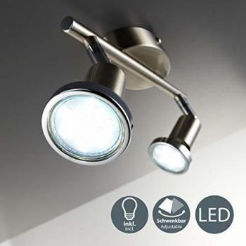 Schwenkbare LED-Deckenlampe mit zwei GU10-Spots in modernem Titanfarbig, die warmweißes Licht von 250 lm pro Strahl liefert und sich flexibel für Wohnzimmer, Kinderzimmer oder Büro eignet.