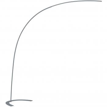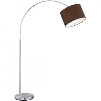 Ein moderner Bogenstand aus mattem Nickel mit einem weichen weißen Stoffschirm, der ein warmes Licht von einer E27-Birne abstrahlt; die Höhe lässt sich flexibel anpassen, um jede Raumgröße zu ergänzen.