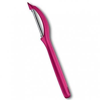 Ein schlanker, pinker Tomaten‑ und Kiwischäler mit einer rostfreien, zackigen Klinge, die in beide Richtungen schneidet; der ergonomische Griff sorgt für sicheren Halt beim schnellen Schälen.