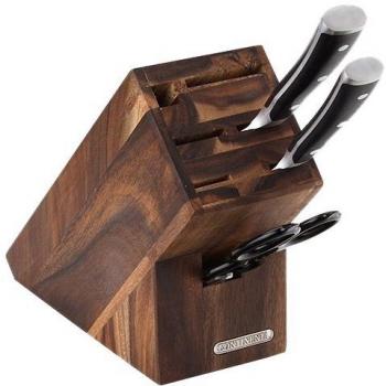 Der schwarze Buchenholzblock trägt fünf präzise Messer aus Spezialklingenstahl, inklusive kompakter Wetzstahlscheibe – ein praktisches Set für feine Küchenarbeit.