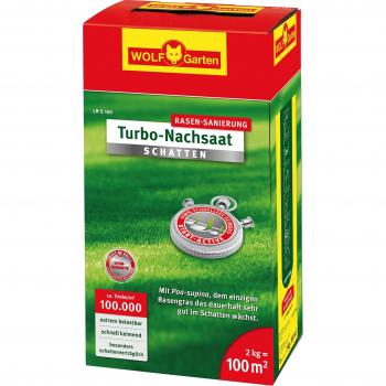 Rotes Turbo-Nachsaat-Schattenrasen für 25 m² sorgt innerhalb weniger Wochen für ein dichtes, grünblattes Gras auf schattigen Flächen und verbessert gleichzeitig die Bodenstruktur.