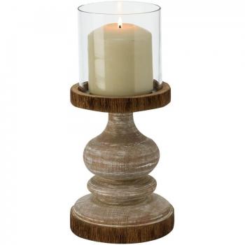 Rustikaler Holz‑Windlicht‑Haltekerze „Woody“ – Glas-Details – 28 cm