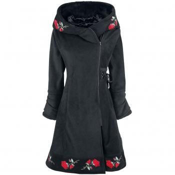 Abrigo negro de estilo gótico con corte entallado y capucha desmontable, tejido 100 % poliéster resistente al viento, forro interior suave que retiene el calor, bolsillos ocultos y ribetes metálicos que aportan un toque steampunk.