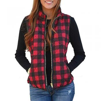 mujer Casual rojo cuadrado estampado sin mangas solapa cremallera Plaid grueso chaleco Cardigan abrigo de túnica bolsillos chalecos #1