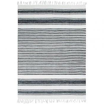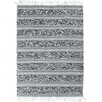 Alfombra de banda etniana en blanco y negro, 100 % algodón suave que aporta calidez y contraste a cualquier estancia. Sus dimensiones de 160 × 230 cm la hacen ideal para salas, pasillos o comedores. Su tejido resistente garantiza durabilidad y fácil mantenimiento, mientras que el diseño de franjas geométricas añade un toque moderno sin perder la esencia tradicional.