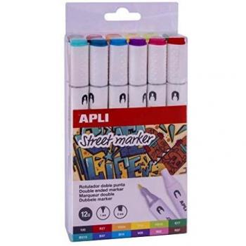 Apli Street Marker Rotuladores de Doble Punta - Punta Redonda de 1mm y Biselada de 6mm - Tinta de Base Alcohol - 12 Colores Surtidos