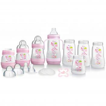 MAM - Juego de biberones anticoliche con auto-esterilización, 2 x 130 ml, 2 x 160 ml, 4 x 260 ml, 4 tetinas de flujo lento, 4 tapones, una boquilla blanda, 1 mango, 1 chupete, Rosa