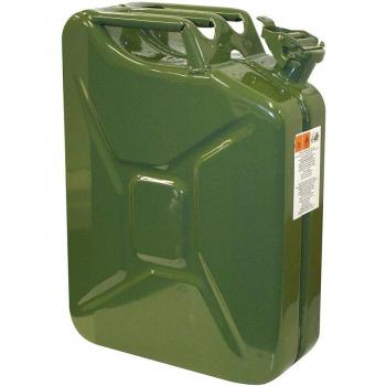 Bidón de gasolina 20 L con acabado verde metálico certificado TUV/GS, diseñado para uso en talleres o garajes. Su tapa a presión evita derrames y el asa reforzada facilita su transporte seguro. La construcción metálica asegura resistencia y durabilidad.