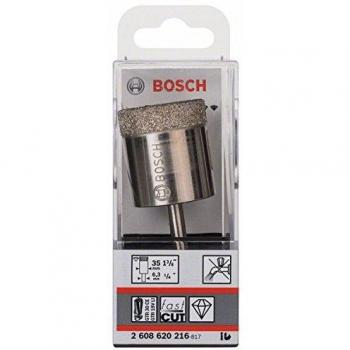 Corona de diamante Bosch Dry Speed de 30 mm por 35 mm, ideal para perforar cerámica sin agua; su núcleo sólido reduce vibraciones y permite cortes limpios y precisos con mínima fricción.
