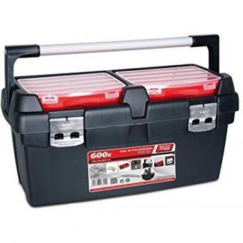 Caja de herramientas de polipropileno con tapa abatible, interior dividido en compartimentos y bandeja extraíble para piezas pequeñas; resistente a golpes, dimensiones 580 × 285 × 290 mm, ideal para talleres o garajes.