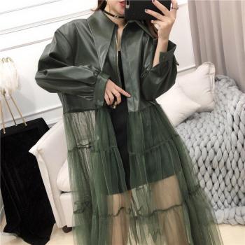 Chaqueta de Primavera para Mujer de LANMREM, Color Sólido, Largo, Malla, Gasa y Cuero PU con Cinturón PB279