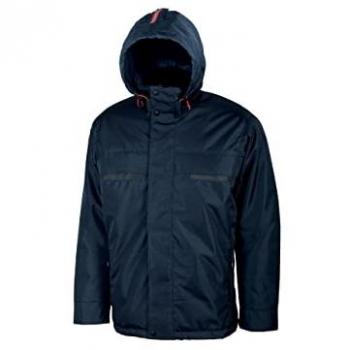Chaqueta UPOWER Space Softshell XL, azul profundo con toques naranjas, combina poliéster y spandex para flexibilidad. Impermeable, antiviento, capucha desmontable y bolsillos con cremallera. Perfecta para trabajos al aire libre en invierno.