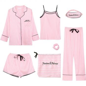 Camisa de dormir HNM-Conjunto de pijamas con estampado de Raya Rosa para mujer, ropa de dormir de satén de seda, 7 piezas, primavera, verano y otoño