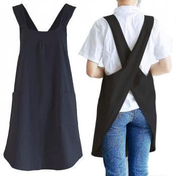Delantal de cocina negro en poliéster, con correa de cuello ajustable que se adapta al tamaño del usuario y dos bolsillos laterales para utensilios, especias o semillas; ideal para cocinar, barbacoa y jardinería.