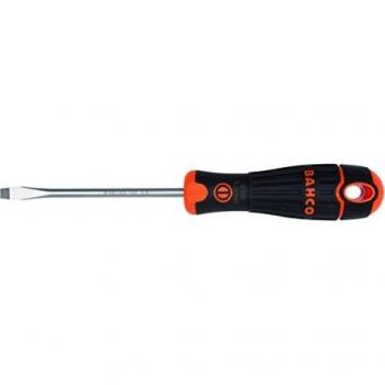 Destornillador compacto con mango de goma ergonómico que ofrece agarre seguro en espacios estrechos; cabezal de acero al carbono de 0,8 mm por 4 mm y filo de 25 mm para precisión y durabilidad.