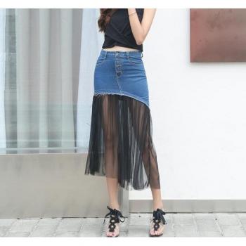 Falda de denim asimétrica con parches y malla para mujer