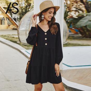 Vestido mini de verano para mujeres, color sólido, con botón, cuello en V, alta cintura, volante, manga larga, estilo A-Line