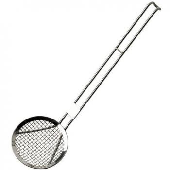 Espumadera monoblock de acero inoxidable 18/10, con mango antideslizante y rejilla estrecha que captura sólidos sin alterar el sabor; su longitud de 34 cm permite una extracción rápida y precisa en cualquier cocina.