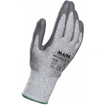 Guantes de corte Mapa Krytech 579 talla 8, con una capa de acero inoxidable integrada a polímero reforzado para máxima protección contra cortes y abrasiones; su diseño ergonómico y superficie antideslizante aseguran agarre firme y comodidad durante tareas exigentes.