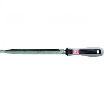 Lima triangular de 3 pulgadas con mango bimaterial que combina firmeza y ergonomía; su filo afilado mantiene la forma durante el uso prolongado, ideal para afilar sierras de carpintería o metalurgia con precisión constante.