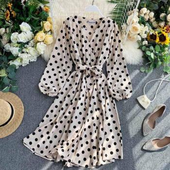 Yuomomuoo-vestido Midi de lunares para mujer, vestido de señora de estilo coreano, de manga larga, verde, , Vintage, con fajas calientes, otoño de
