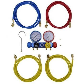 Conjunto práctico de manómetros a doble vía con mangueras de alta resistencia, diseñado para verificar la presión en sistemas industriales de aire acondicionado; incluye válvulas de cierre y adaptadores compatibles con refrigerantes comunes.