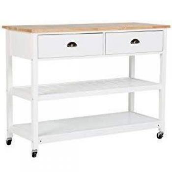 Carrito de cocina blanco con ruedas y encimera de madera clara
